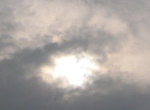 雲と雲の間に日が射してきたので、日食メガネを付ける。
